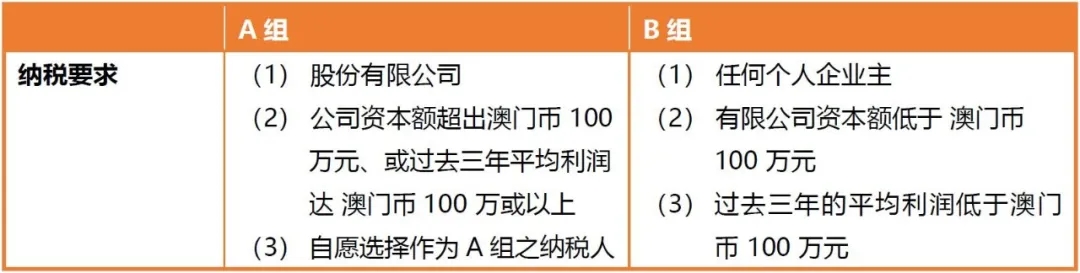 澳門(mén)承襲了葡萄牙的稅務(wù)呈交系統(tǒng),將公司劃分為兩大類(lèi)別,俗稱(chēng)「A 組」及「B 組」。